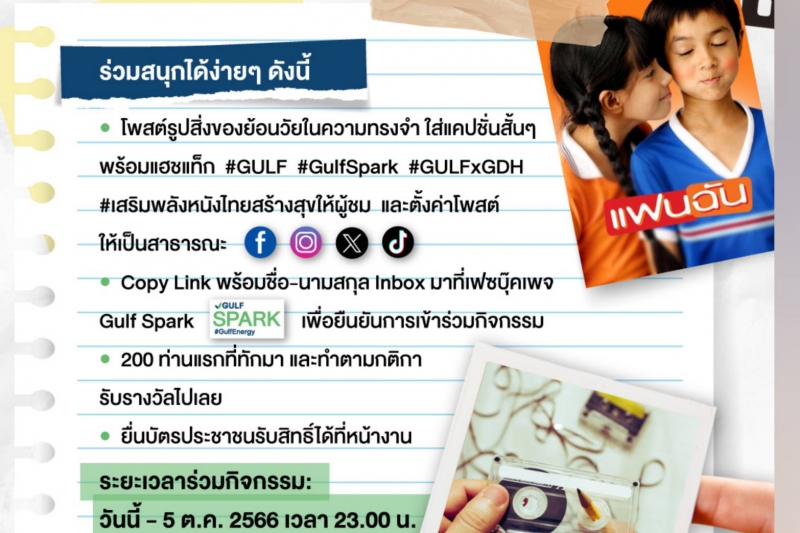 • โพสต์รูปสิ่งของย้อนวัย ในความทรงจำ ใส่แคปชั่นสั้นๆ พร้อมแฮชแท็ก #GULF #GulfSpark #GULFxGDH #เสริมพลังหนังไทยสร้างสุขให้ผู้ชม และตั้งค่าโพสต์ให้เป็นสาธารณะ (โพสต์ได้ในทุกโซเชียลแพลทฟอร์ม ทั้ง Facebook, Instagram, X และ Tiktok)