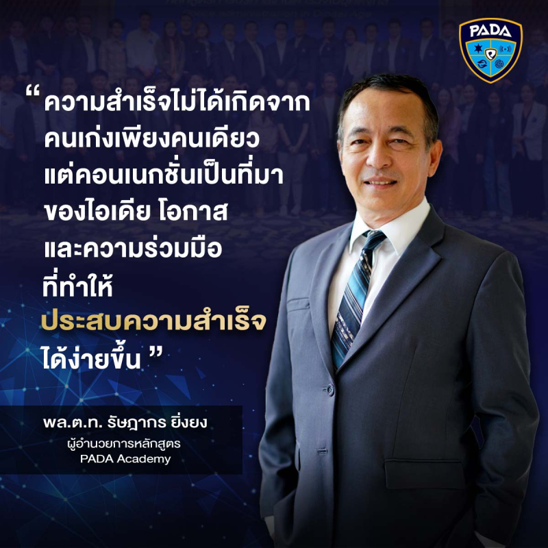 พล.ต.ท.รัษฎากร ยิ่งยง ผู้อำนวยการหลักสูตร PADA “สถาบันการเรียนรู้สู่โลกอนาคต” ขอเชิญผู้ประกอบการ นักธุรกิจ และ ผู้ที่สนใจ เข้าร่วมอบรมหลักสูตรการบริหารงานตำรวจในยุคดิจิทัล หรือ PADA รุ่น 11 ระหว่างวันที่ 16 สิงหาคม ถึง 29 พฤศจิกายน 2567 ที่โรงแรมรามาการ์เด้นส์ ซึ่งหลักสูตรนี้ มุ่งเน้นการสร้างผู้นำองค์กรในยุค digital disruption เพื่อให้ผู้บริหารและผู้นำองค์กรรู้เท่าทันการเปลี่ยนแปลง นำองค์กรไปในทิศทางที่ปลอดภัยและคว้าโอกาสแห่งอนาคตได้ก่อนใคร