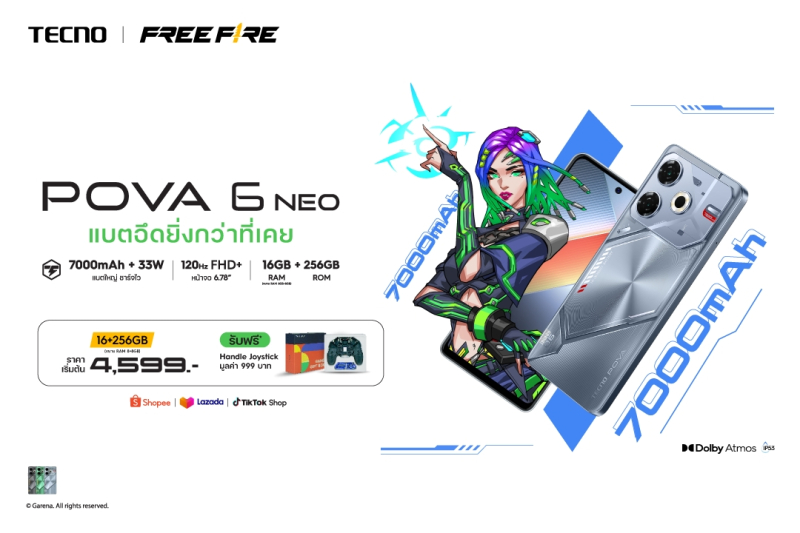 กรุงเทพฯ, 27 สิงหาคม 2567 – TECNO ประกาศเปิดตัวสมาร์ตโฟนรุ่นล่าสุด TECNO POVA 6 NEO ในประเทศไทยอย่างเป็นทางการ ภายใต้สโลแกน แบตอึดยิ่งกว่าที่เคย ซึ่งออกแบบมาเพื่อผู้ที่ต้องการใช้งานสมาร์ตโฟนได้อย่างยาวนานตลอดทั้งวัน และยังมาพร้อมกับฟีเจอร์ที่อัดแน่น เอาใจเหล่าเกมเมอร์ พร้อมกับแพ็กเกจสุดเอ็กซ์คลูซีฟจาก Free Fire โดยได้ตัวละครสุดจีเนียสอย่าง ‘MOCO’ มาคอลแลปดีไซน์อยู่บนตัวกล่อง นอกจากนี้ยังมี Free Fire Pet Sticker อีกด้วย ในราคาโปรโมชั่นเริ่มต้นเพียง 4,599 บาท พร้อมรับฟรี! Premium Gift Handle Joystick มูลค่า 999 บาท (ของแถมมีจำนวนจำกัด)