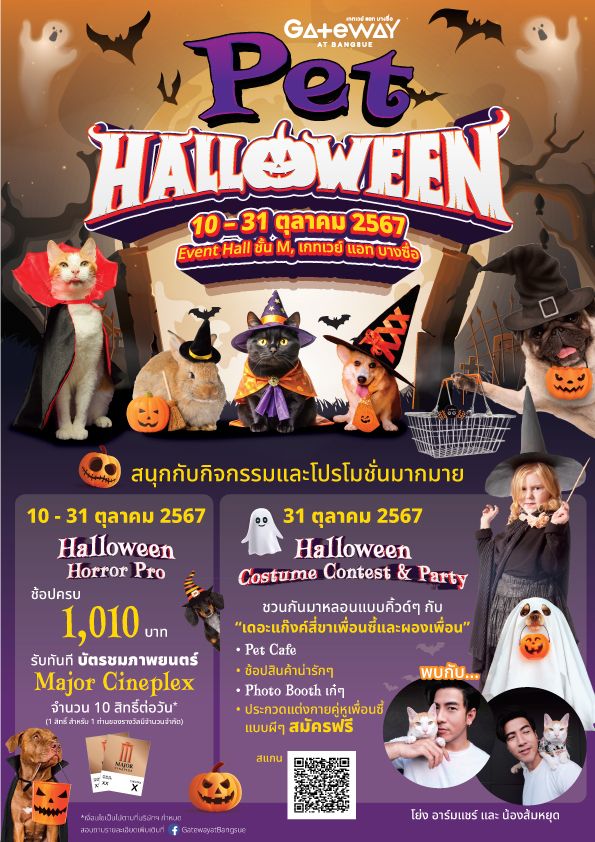 กรุงเทพฯ 2 ตุลาคม 2567 – ศูนย์การค้า เกทเวย์ แอท บางซื่อ ภายใต้การบริหารของบริษัท แอสเสท เวิรด์ คอร์ป จํากัด (มหาชน) หรือ AWC ผู้พัฒนาอสังหาริมทรัพย์ของไทยที่มุ่งเน้นตอบสนองไลฟ์สไตล์แบบครบวงจร ต้อนรับเทศกาลฮาโลวีนปีนี้ ด้วยการชวนทุกคนมาหลอนแบบคิ้วด์ๆ กับเดอะแก๊งค์สี่ขาเพื่อนซี้และผองเพื่อน พร้อมทั้งกิจกรรมสนุกๆ และโปรโมชั่นดีๆ ตลอดเดือนตุลาคม กับกิจกรรม Pet Halloween เริ่มต้นด้วยโปรโมชั่นต้อนรับเดือนตุลาคม กับ Halloween Horror Pro เพียงช้อปสินค้าหรือทานอาหารภายในศูนย์การค้าเกทเวย์ แอท บางซื่อ ครบ 1,010 บาท แลกรับ บัตรชมภาพยนตร์ Major Cineplex (1 สิทธิ์ 1 ที่นั่ง จำกัด 10 สิทธิ์/วัน/ท่าน ไม่สามารถรวมใบเสร็จได้) ตั้งแต่วันที่ 10 – 31 ตุลาคม 2567