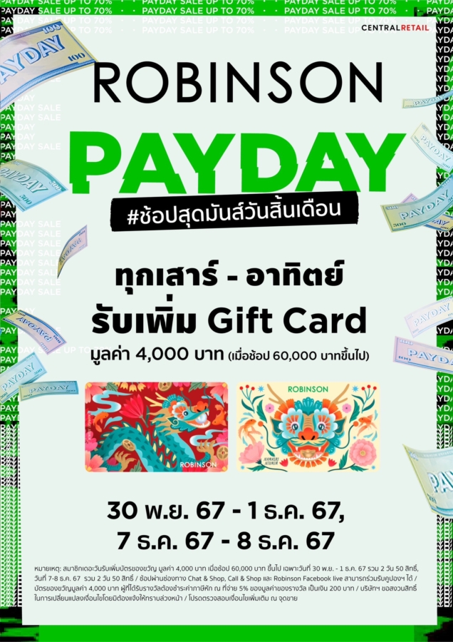 มา #ช้อปสุดมันส์วันสิ้นเดือน กับแคมเปญ ROBINSON PAYDAY CELEBRATION” ตั้งแต่วันที่ 27 พ.ย. 67 – 8 ธ.ค. 67 ที่ห้างโรบินสันทุกสาขา (ยกเว้นสาขาพะเยาและจังซีลอน) รวมทั้งหลากหลายช่องทางการช้อปปิ้งสุดสะดวกของห้างฯ ไม่ว่าจะเป็น Robinson Chat & Shop, Robinson Personal Shopper On Demand โทร.1425 ผู้ช่วยส่วนตัวสำหรับทุกคน Central App และเว็บไซต์ www.central.co.th ตลอด 24 ชั่วโมง รวมทั้ง Facebook Fanpage: Robinson Department Store