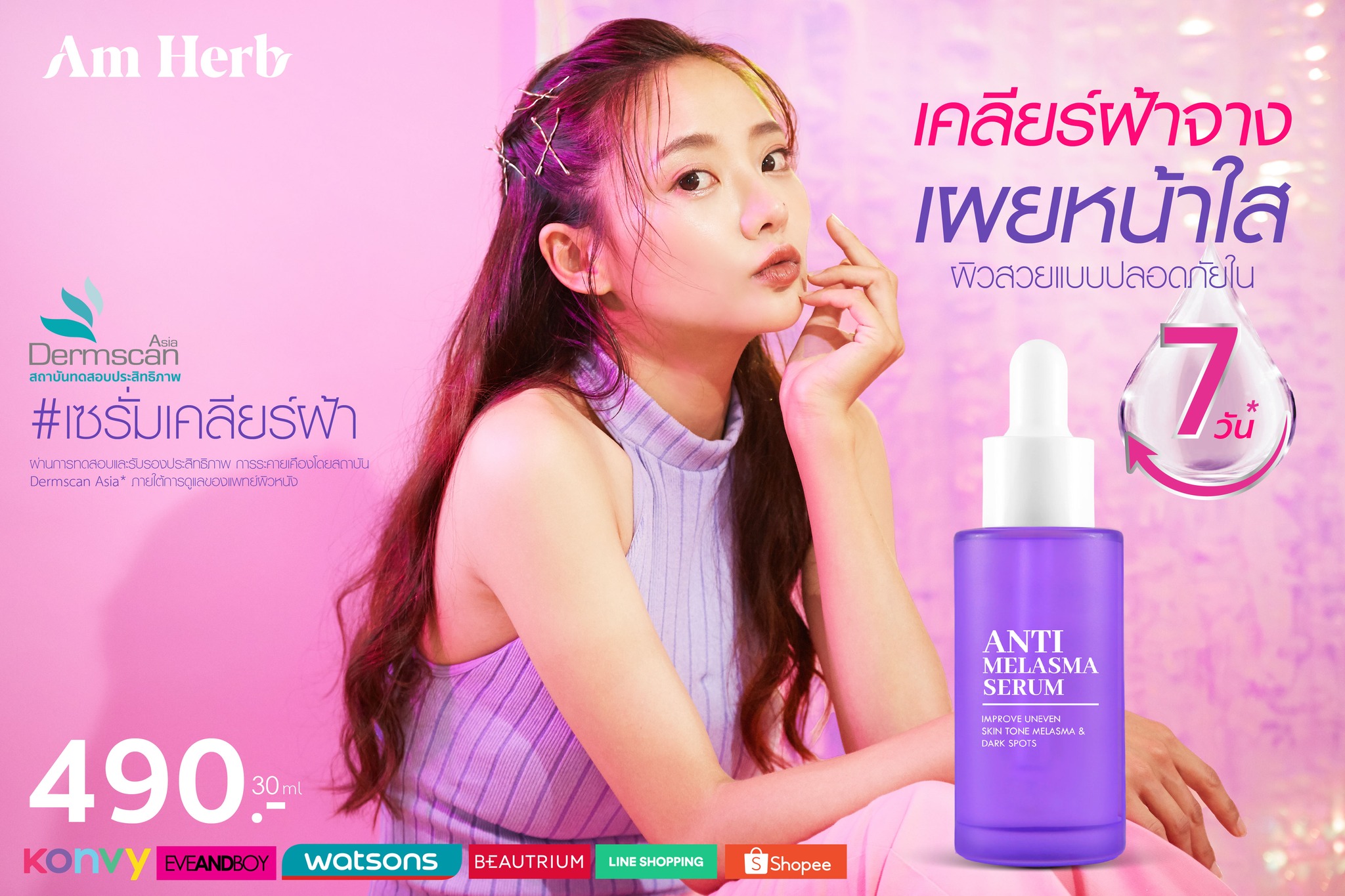 สินค้าเซรั่มเคลียร์ฝ้าขายดีและสุดฮอตสุดปังในตอนนี้กับ Am Herb ผลิตภัณฑ์ (Am Herb Anti – Melasma Serum) อัม เฮิร์บ แอนตี้ เมลาสมา เซรั่ม เซรั่มฝ้าเนื้อเข้มข้น สร้างยอดขายอันดับ 1 ของแบรนด์จนฉุดไม่อยู่ ให้เนื้อสัมผัส บางเบา ซึมเร็ว ไม่เหนียวเหนอะหนะ พัฒนามาเพื่อช่วยลดเลือน ฝ้าลึก ฝ้าตื้น ฝ้าแดด กระ จุดด่างดำ อย่างตรงจุด เห็นผลได้จริงใน 7 วัน การันตีผลจาก Dermscan Asia พร้อมทั้งปรับสีผิวสม่ำเสมอ เรียบเนียน ริ้วรอยจางลงแลดูอ่อนเยาว์ ด้วยสูตรที่อ่อนโยน ปลอดภัย ไม่ก่อให้เกิดการระคายเคืองกับผิว หรือให้นิยามว่า “เซรั่มเคลียร์ฝ้า เคลียร์ทุกจุดหยุดฝ้า” ด้วยรูปแบบแพคเกจจิ้งที่สีม่วงสวยงามทันสมัย และช่วยกรองแสง รักษาประสิทธิภาพ คุณภาพของเซรั่มได้ยาวนานยิ่งขึ้น